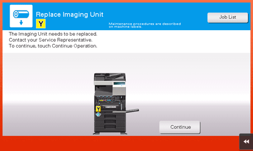 When it is time to replace an Imaging Unit, printing can be forcibly continued using black. Tap [Continue], and then select a desired print job.