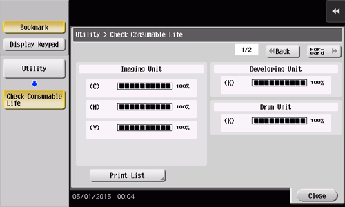 Check the status of consumables (consumption level) using the Touch Panel. When necessary, each level can be printed in list form.