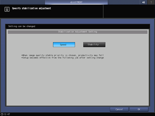 If you select Stability, you can individually set the maximum density adjustment frequency in Administrator Setting. refer to Stabilization Adj. Setting.