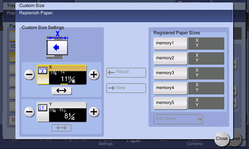 [Custom Size Settings] | Enter the length (X) and width (Y) of paper. After you entered the size, select a key ([memory1] to [memory5]) in [Registered Paper Sizes], and tap [New]. Then the size you have entered is registered in the memory. You can recall the registered size at a later date. |