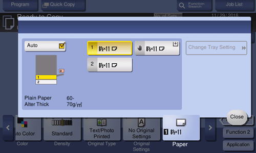 Paper Tray | Specifies the paper loaded in the paper tray when making a copy. The displayed contents vary depending on the options installed on this machine. |