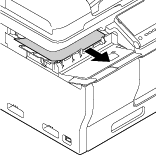 Überprüfen Sie das Verarbeitungsfach des Finishers und ziehen Sie dann das falsch eingezogene Papier vorsichtig aus dem Ausgabebereich.