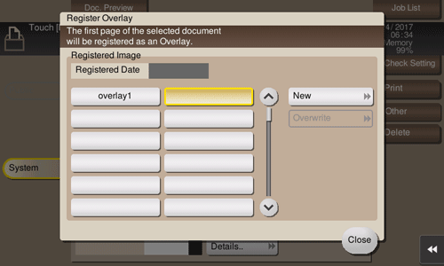 Speichert eine Datei als Overlay-Bild. Nach der Registrierung können Sie während des Kopierens oder Druckens ein Overlay-Bild auf dem Original erstellen.