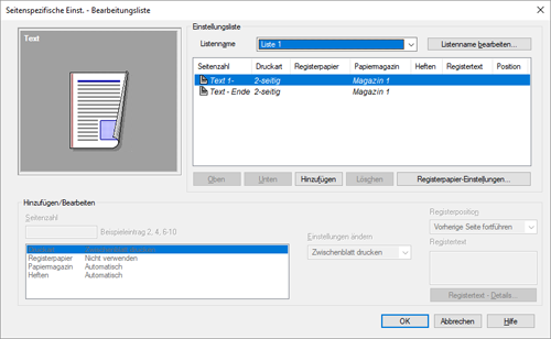 Erstellen Sie eine Liste, indem Sie das Papier und die Druckeinstellungen für jede Seite angeben.