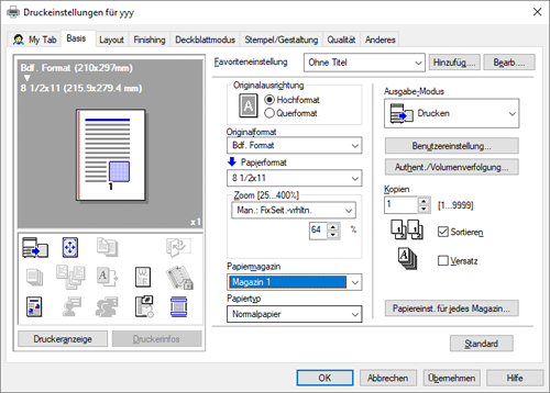 Wählen Sie unter [Papiermagazin] auf der Registerkarte [Basis] das Papiermagazin für den Druck der Textseiten aus.