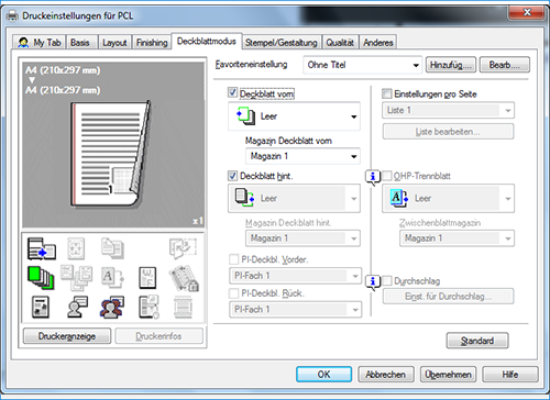 Aktivieren Sie auf der Registerkarte [Deckblattmodus] das Kontrollkästchen [Deckblatt vorn] oder [Deckblatt hint.]