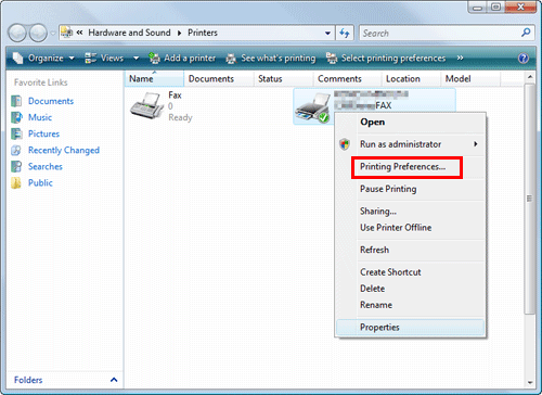 Klicken Sie unter Windows Server 2008 mit der rechten Maustaste auf das Symbol des installierten Druckers und klicken Sie dann auf [Druckeinstellungen...]