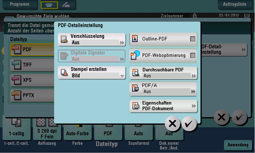 Für die Erstellung einer PDF-Datei, die für die Web-Ansicht optimiert ist, wählen Sie [PDF] oder [Kompaktes PDF] als Dateityp und setzen dann [PDF-Weboptimierung] unter [PDF-Detaileinstellung] auf EIN (Standard: AUS).