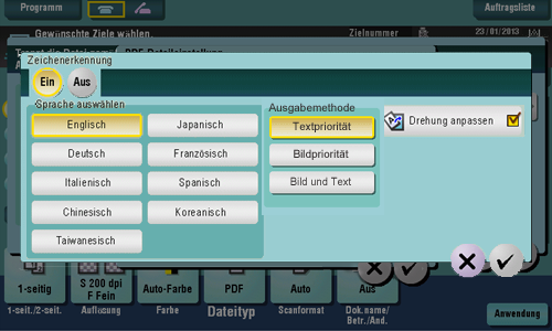 [Sprache auswählen] | Wählen Sie eine Sprache für die OCR-Verarbeitung. Wählen Sie die im Original verwendete Sprache, um die ordnungsgemäße Erkennung der Textdaten sicherzustellen. | |