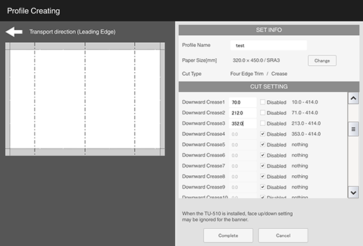 4 | [1x1-3x3 Cutting(CR)] | Set trim and crease positions. | Widthwise 140.0 mm to 330.2 mm, lengthwise 143.0 mm to 1,300.0 mm / Widthwise 5.51" to 13", lengthwise 5.63" to 51.18" | Widthwise 85.0 mm / 3.35" or higher, lengthwise 133.0 mm / 5.24" or higher | 128 g/m2 to 300 g/m2 / 34 lb Bond to 81 lb Bond (Coated paper: 157 g/m2 to 300 g/m2 / 42 lb Bond to 81 lb Bond) | Secondary (sub) tray of Trimmer Unit TU-510 |