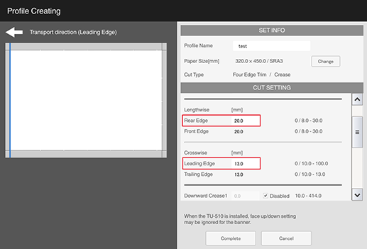 C1 | [Crosswise] - [Leading Edge] (amount of lead edge to be cut) | 0 mm / 0" (None) or 10.0 mm to 20.0 mm / 0.39" to 0.79" |