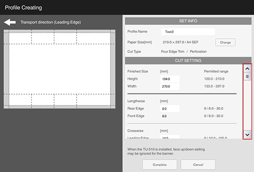 5 | [1x1-1x3 Cutting(PE)] | Set trim and perforation position. | Widthwise 140.0 mm to 330.2 mm, lengthwise 143.0 mm to 1,300.0 mm / Widthwise 5.51" to 13", lengthwise 5.63" to 51.18" | Widthwise 120.0 mm / 4.72" or higher, lengthwise 133.0 mm / 5.24" or higher | 128 g/m2 to 400 g/m2 / 34 lb Bond to 106 lb Bond (Coated paper: 136 g/m2 to 400 g/m2 / 37 lb Bond to 106 lb Bond) | Secondary (sub) tray of Trimmer Unit TU-510 |