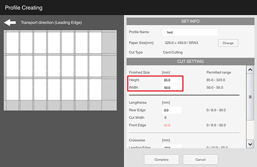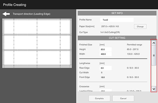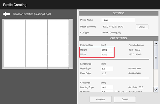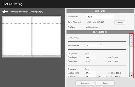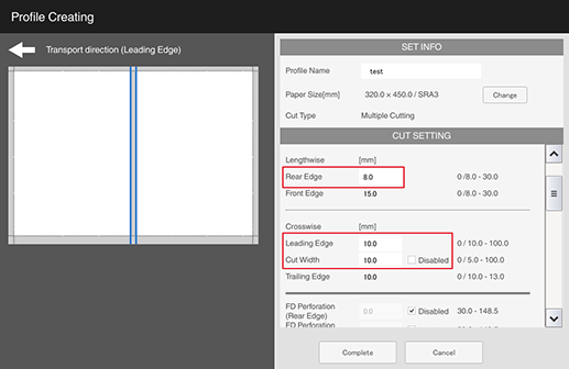 S1 | [Lengthwise] - [Rear Edge] (amount of top edge to be cut) | 0 mm / 0" (None) or 8.0 mm to 30.0 mm / 0.31" to 1.18" Set the difference between [Rear Edge] (amount of top edge to be cut) and [Front Edge] (amount of bottom edge to be cut) within 10.0 mm / 0.39". Cutting only [Rear Edge] (amount of top edge to be cut) or only [Front Edge] (amount of bottom edge to be cut) is not possible. |