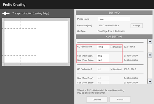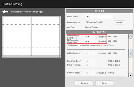 The perforation positions are set at 30 mm / 1.18" or more from the trim area. If the perforation positions is 2, set the distance between the rear and front perforation positions at 100 mm / 3.94" or more.