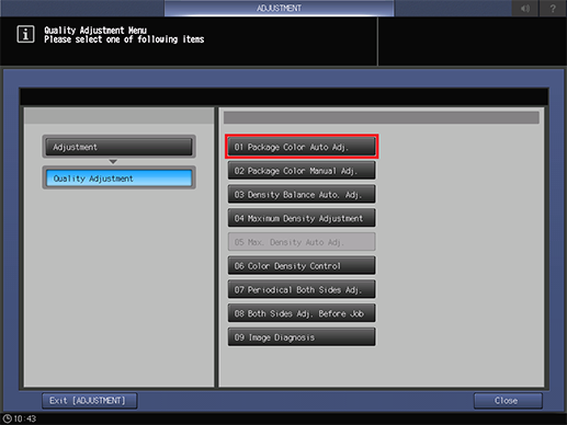 Set the timing for automatically performing [Package Color Auto Adj.] on [Auto Run]. For details, refer to Setting Items.