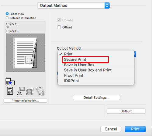 In [Output Method:] in the [Output Method] window, select [Secure Print].