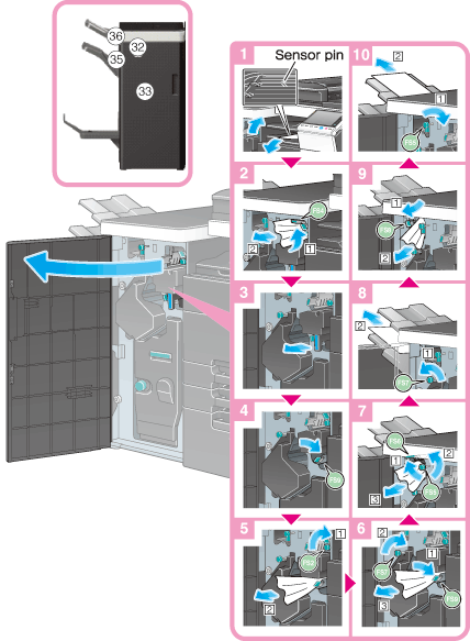 The following illustrations show how to fix a paper jam occurring on the Finisher FS-535.