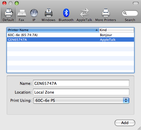 Gehen Sie unter Mac OS X 10.4/10.5 folgendermaßen vor, um einen Drucker mit einer AppleTalk-Verbindung hinzuzufügen: