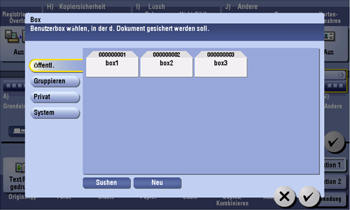 Wenn Sie das Original in einer öffentlichen Box, persönlichen Box oder Gruppenbox speichern möchten, tippen Sie auf [Öffentl.], [Privat] oder [Gruppieren] und wählen Sie die Zielbox aus. Tippen Sie auf [Neu] und geben Sie eine neue Boxnummer ein, um die Zielbox zu registrieren.