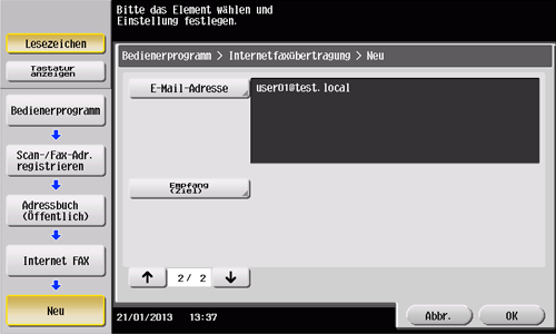 Tippen Sie auf [Bedienerprogramm] - [Adresse/ Box] - [Scan-/Fax-Adresse registrieren] - [Adressbuch (Öffentlich)] - [Internet-Fax] - [Neu].