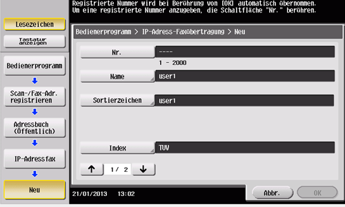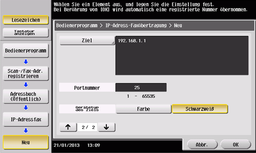 Tippen Sie auf [Bedienerprogramm] - [Adresse/ Box] - [Scan-/Fax-Adresse registrieren] - [Adressbuch (Öffentlich)] - [IP-Adr. Fax] - [Neu].