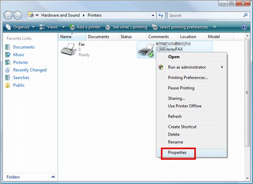 Unter Windows 7/8/8.1/Server 2008 R2/Server 2012/Server 2012 R2 klicken Sie mit der rechten Maustaste auf das Symbol des installierten Druckers und klicken dann unter [Druckereigenschaften] auf den angezeigten Druckernamen.