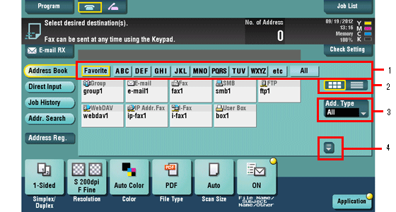 Switches the display of the registered destinations to the button or list view mode. If the list view mode is selected, you can sort destinations by registration number, destination type, or registered name. |