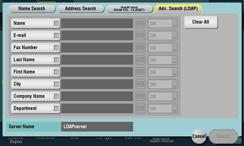 Tap [Addr. Search] - [Search] - [Address Search (LDAP)] or [Adv. Search (LDAP)].