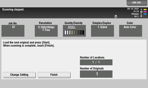 After all originals are scanned, tap [Finish] and press the Start key.