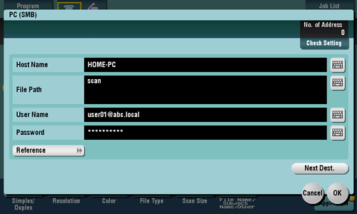Directly type in the host name and file path of the destination, or tap [Reference] and specify the shared folder of the destination. Then, tap [OK].