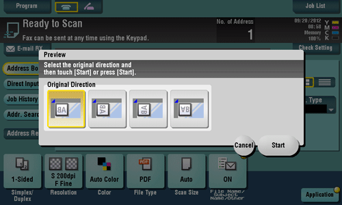 When destinations other than those for faxes are also specified for the destinations, the preview appears with the window for changing the settings for the scan function selected. To check the fax preview, tap [Fax] to switch the display.