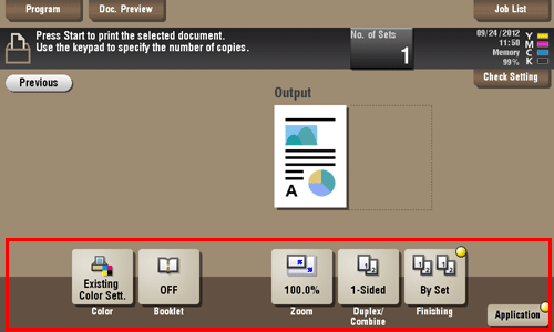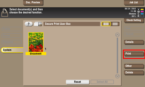 If the [Prohibited Functions When Authentication Error] is set to [Mode 2], you need to enter the password to select a file from the Secure Print User Box. You need to enter a password for each file even if secure documents have the same document ID. Therefore, the security level is higher than that of default [Mode 1]. For details on [Prohibited Functions When Authentication Error], refer to Here.