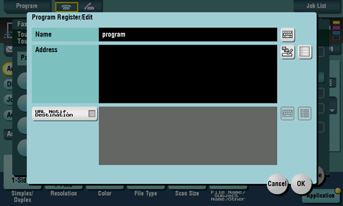 [Address] | Specify if you want to include a destination for the program. Specify either by direct input or by selecting among the destinations registered on this machine. Only one destination can be specified. |