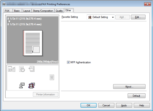 [MFP Authentication] | Select this check box to log in using the MFP authentication function when both MFP authentication and server authentication are used for user authentication. This option is available when [Device Option] - [User Authentication] in the [Configure] tab is set to [ON (MFP) + ON (External Server)] or [ON (MFP) + ON (Enhanced Server)]. |