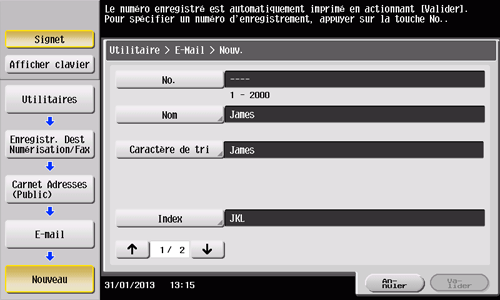 Tapez sur [Utilitaire] - [Enregistrement 1-Touche/Boîte] - [Enregistr. Dest Numérisation/Fax] - [Carnet Adresses (Public)] - [E‑mail] - [Nouveau].