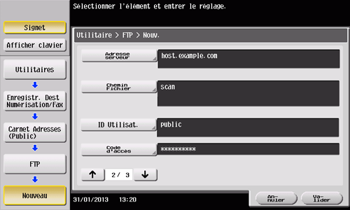 Tapez sur [Utilitaire] - [Enregistrement 1-Touche/Boîte] - [Enregistr. Dest Numérisation/Fax] - [Carnet Adresses (Public)] - [FTP] - [Nouveau].