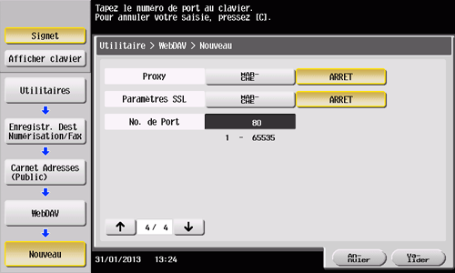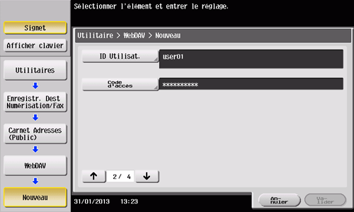 Tapez sur [Utilitaire] - [Enregistrement 1-Touche/Boîte] - [Enregistr. Dest Numérisation/Fax] - [Carnet Adresses (Public)] - [WebDAV] - [Nouveau].