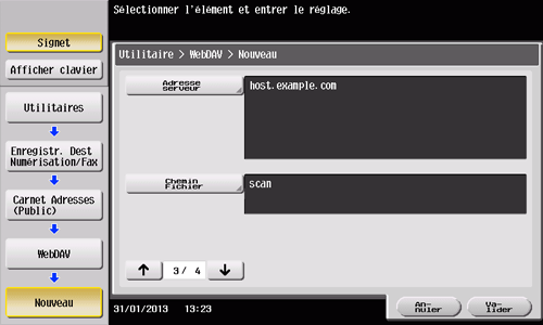 Vous pouvez également enregistrer une destination WebDAV en utilisant Web Connection. Pour des détails, voir ici.
