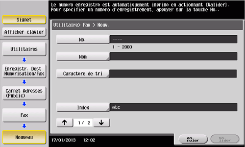 Tapez sur [Utilitaire] - [Enregistrement 1-Touche/Boîte] - [Enregistr. Dest Numérisation/Fax] - [Carnet Adresses (Public)] - [Fax] - [Nouveau].