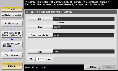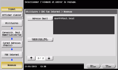 Tapez sur [Utilitaire] - [Enregistrement 1-Touche /Boîte] - [Enregistr. Dest Numérisation/Fax] - [Carnet Adresses (Public)] - [FAX Internet] - [Nouveau].
