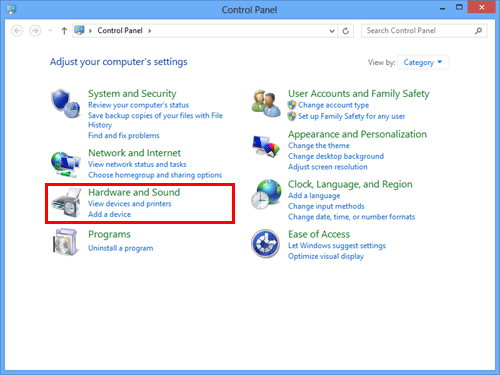Sous Windows Server 2012/Server 2012 R2, ouvrez la fenêtre Démarrer, puis cliquez sur [Panneau de configuration] - [Matériel] - [Afficher les périphériques et imprimantes].